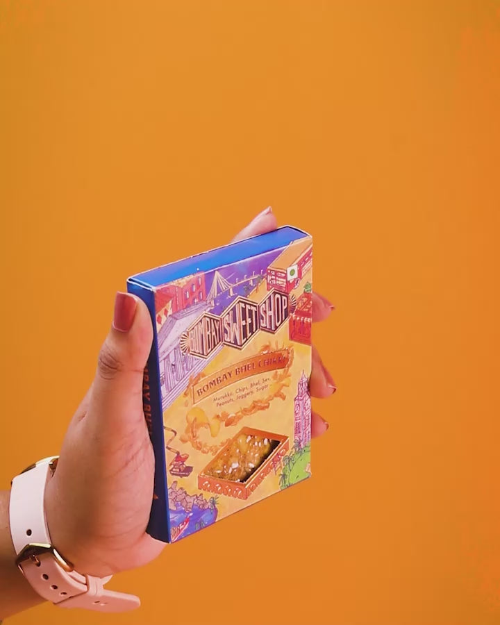 Inspired by all our favourite snacks, our Bombay Bhel Chikki is a fun sweet and savoury Chikki Bar that has potato chips, sev, chakli, salli, gathia, peanuts and a unique Bombay Sweet Shop spice mix for that lingering sour and spicy flavour. It took our team numerous attempts to get the proportions right of each ingredient. Yes, there can be something as too much chips!